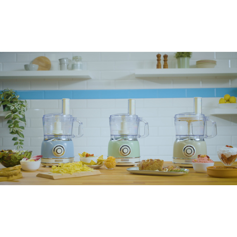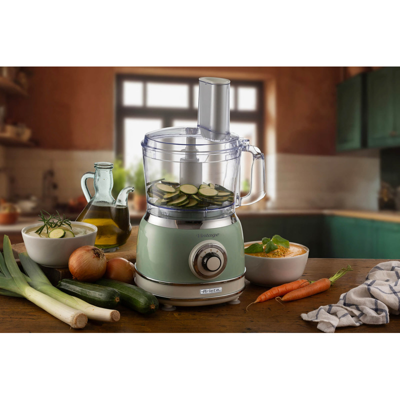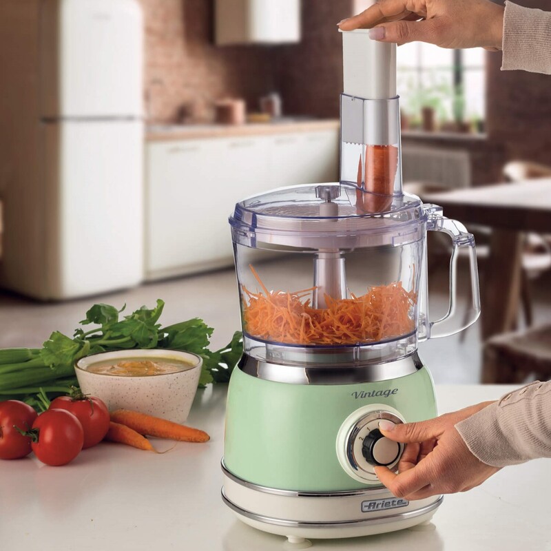Kuchyňský robot Ariete 1781 Vintage v zelené barvě vám ulehčí šlehání, krájení, sekání i hnětení – stylově a efektivně.