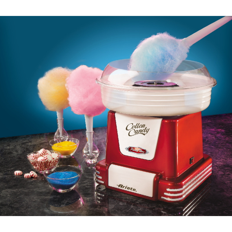 ARIETE 2971 Cotton Candy - stroj na přípravu cukrové vaty Stroj na výrobu cukrové vaty v Retro stylu Ariete 2971 Cotton Candy nadchne všechny milovníky cukrové vaty. Na výrobu cukrové vaty lze použít jak krystalový cukr tak tvrdé bonbony. Jednoduchá obsluha, snadné čištění.